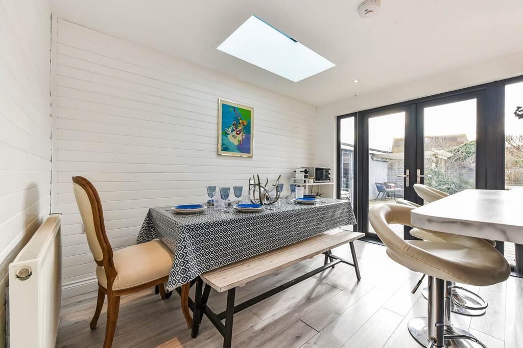 The sitting room is situated off the hallway and flows seamlessly into the extended kitchen in a bright and airy open plan design. The kitchen is a true highlight, featuring contemporary gloss grey units complemented by contrasting white brick tiling. It boasts integrated appliances, including an oven, hob and wine fridge, along with ample space for an American-style fridge freezer (negotiable) and a dishwasher. A striking island with a breakfast bar provides additional workspace, while the room comfortably accommodates a family dining table, making it an ideal space for entertaining or everyday use.