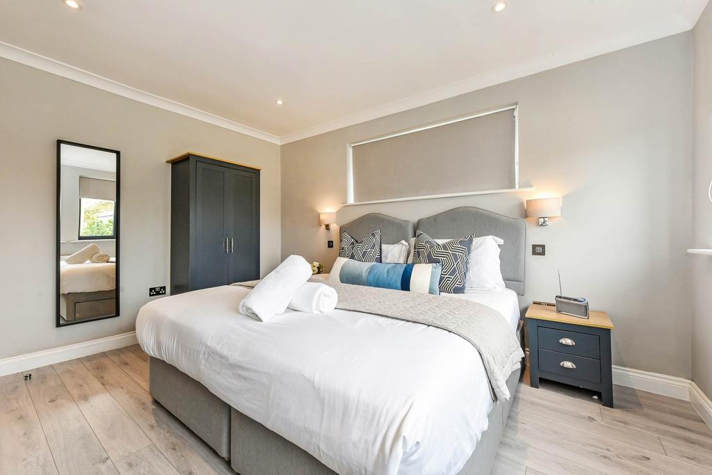 Inside, the accommodation includes three well proportioned bedrooms, all generous in size. The master bedroom is flooded with natural light thanks to its dual-aspect windows and comfortably accommodates a king size bed along with additional furniture. A key feature of the refurbishment is the addition of a separate shower room, complementing the stunning main bathroom, which features a luxurious finish and an integrated TV.