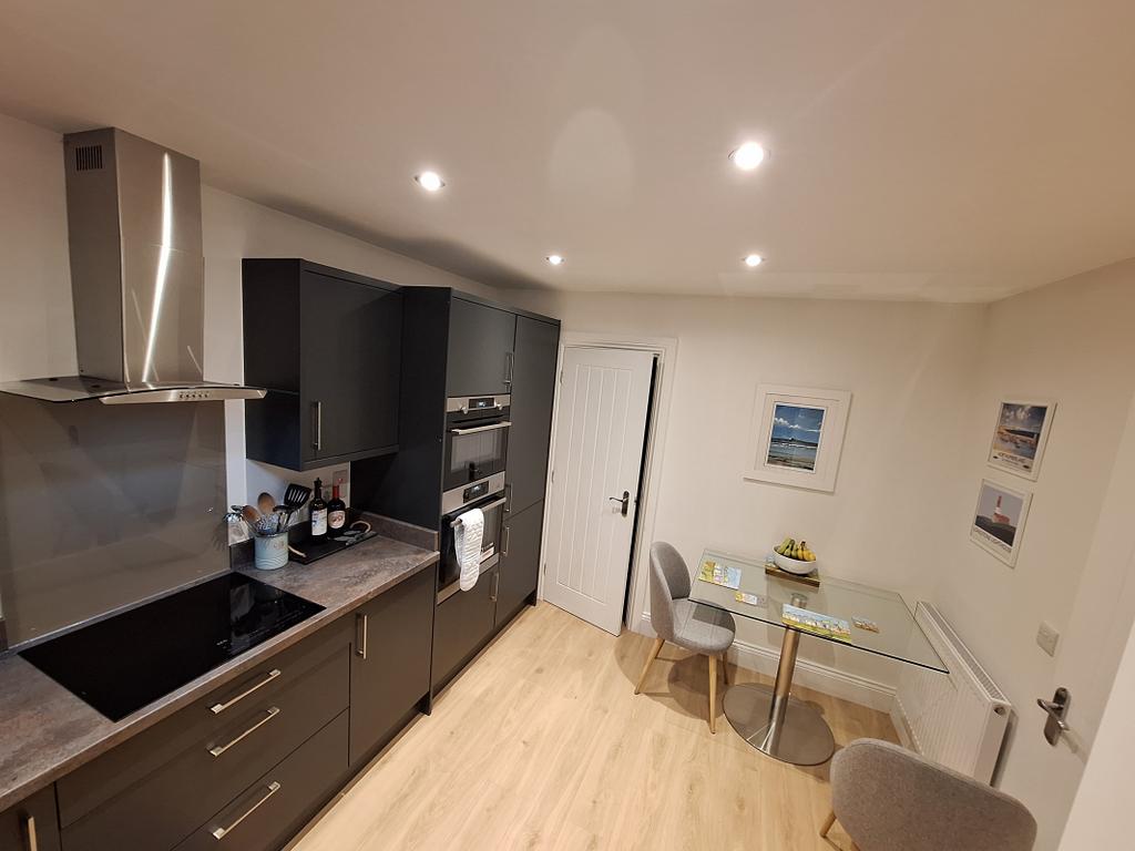 The kitchen is a modern and well-equipped space, complete with a range of wall and base units, an integrated double oven, induction hob and extractor. There is also an integrated dishwasher and fridge/freezer. The kitchen leads to a utility room with plumbing and power for a washing machine and dryer.