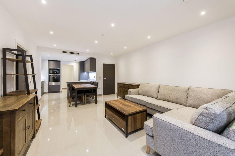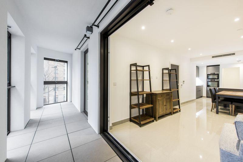 It features an open-plan living area with a modern kitchen leading to a large winter garden. Additionally, there are two bedrooms and two contemporary bathrooms, one ensuite. The apartment boasts underfloor heating for added comfort.