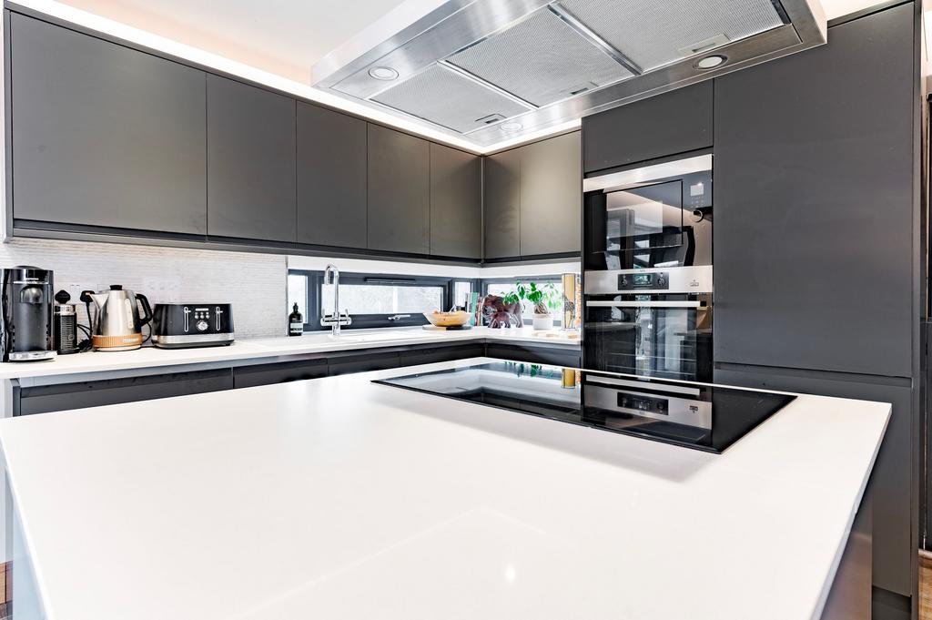 The kitchen is a showpiece in itself, with an L-shaped corner window bringing in natural light, a sleek central island housing an integrated induction hob, and a full suite of appliances, including a built-in wine fridge. The flow continues through large patio doors that open directly onto the garden, perfect for indoor-outdoor living and entertaining.
