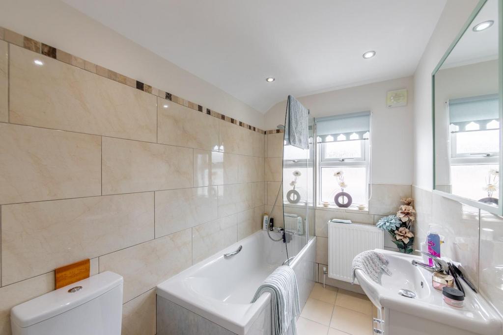 Upstairs, the first-floor landing provides access to three bedrooms—two doubles and one single. The master bedroom benefits from built-in storage. The family bathroom is well-equipped with a low-level WC, a basin, and a bath with an over-bath shower and glass screen. The room features tiled floors and partially tiled walls.