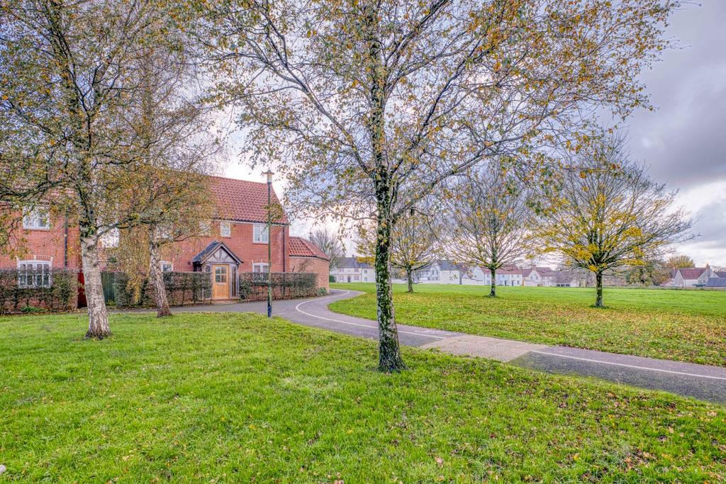 The south-facing rear garden is predominantly laid to lawn, with patio areas and sleeper flower beds. From the garden, access is provided to the single garage and parking area, which accommodates at least two vehicles. Additionally, there is a separate room in the garage, ideal for use as an office space.