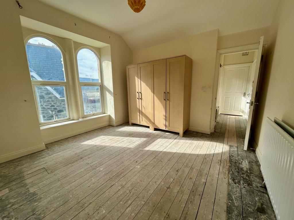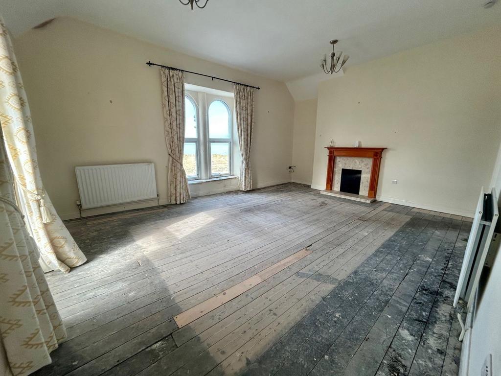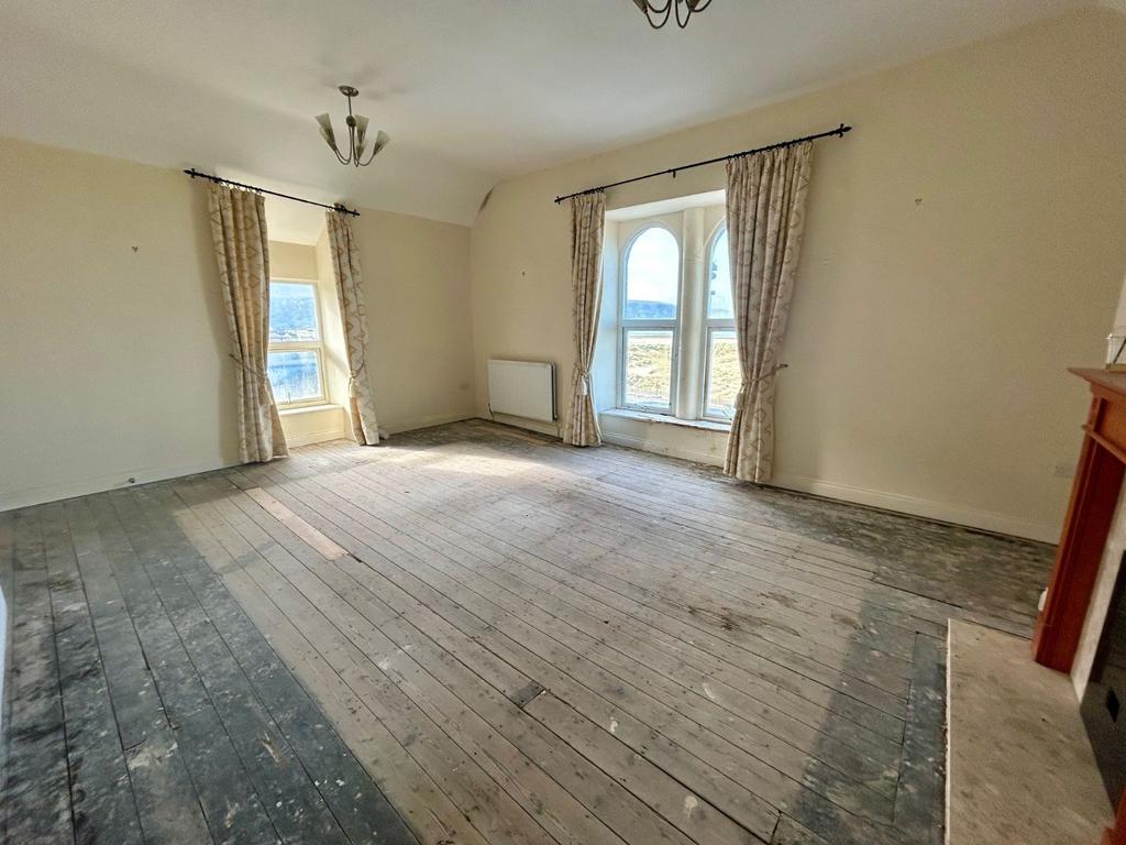 Two feature arch windows with spectacular sea views, side window with views, marble fireplace and hearth with wooden surround (currently no fire installed), 2x radiators, carpet.