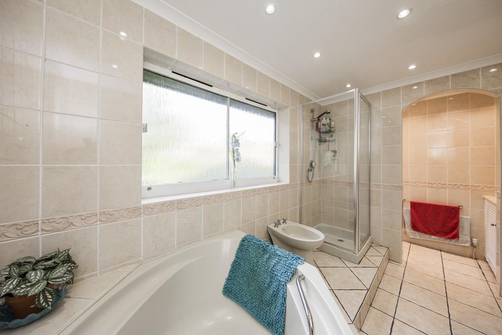 FAMILY BATHROOM: Corner bath with side taps, tiled cubicle with integrated shower, vanity wash hand basin with storage under, wc, bidet, ladder style heated towel rail and obscured windows to rear.