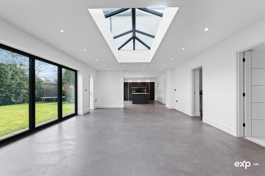 The family dining living area is open to the kitchen. There is plenty of space here to add relaxed seating as well as dining furniture. The lavish luxury décor showcases a feature active Venetian living art wall, which constantly changes with the environment. An imposing lantern roof works with the strategically placed downlighting peppered across the ceiling to give a light-filled space, plus there are two pencil windows to the rear along with three panel bi-folding doors overlooking the garden. There is a television point here. The micro cement flooring with underfloor heating continues from the kitchen area.