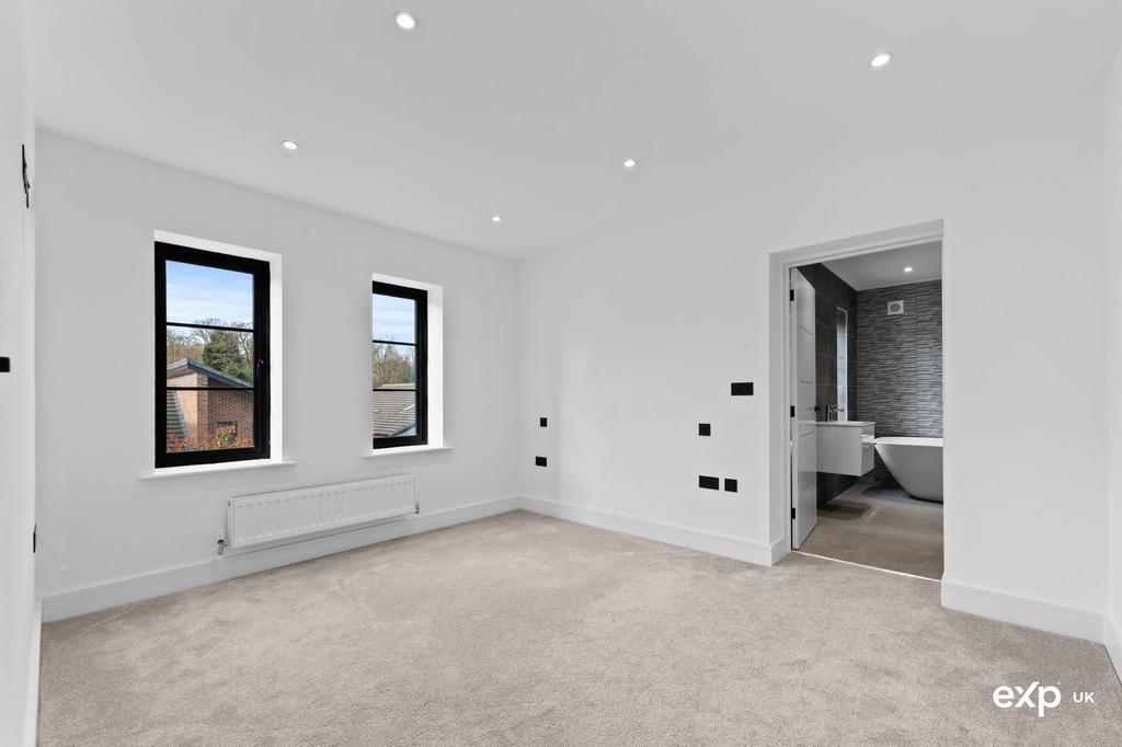 This spacious bedroom boasts a feature height ceiling with atmospheric downlighting. There is a television point and a radiator. There are double doors with an attractive Juliet balcony to the rear. The room enjoys the benefit of its own private en-suite, as do all five of the bedrooms.
