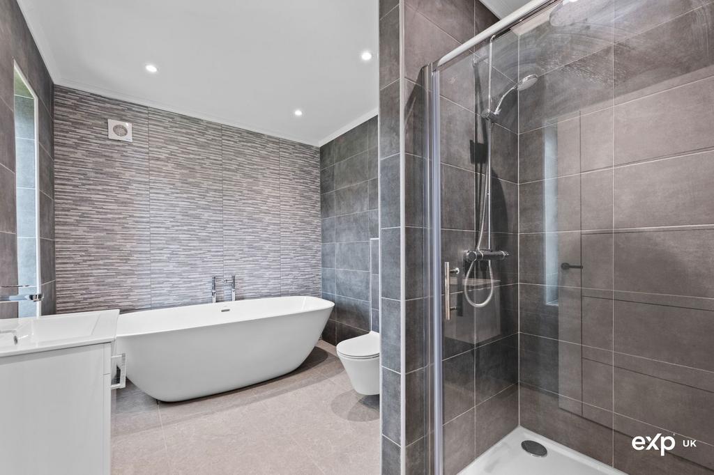This four-piece suite comprises a modern slipper bath, a separate shower cubicle, a wash basin in a stylish vanity unit, and a low flush w.c. The room is decorated with tiled walls and finished with tiled flooring. There is a pencil window to the front, downlighting, and a heated towel rail.