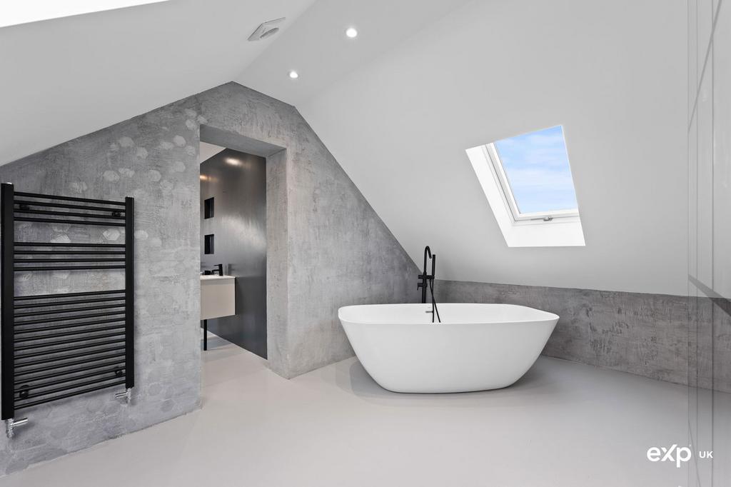 Private en-suite facilities for the principal bedroom comprise a primary area having attractive twin wash basins in vanity units and a low flush w.c. This area is decorated with feature Venetian plaster concrete walls and micro cement flooring. There is a heated towel rail and two Velux windows to the rear. This room then leads through to a further area that hosts a luxurious retreat with a double-ended bath and a separate walk-in shower cubicle. There is a heated towel rail and dual-aspect Velux windows to the front and rear.