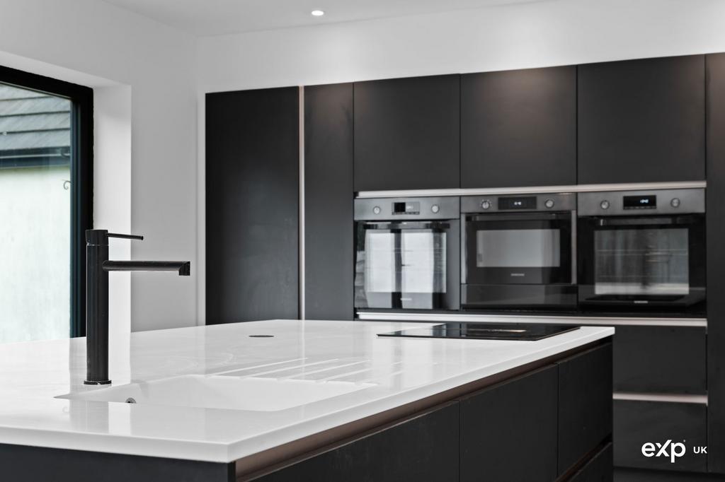 The high specification kitchen boasts premium top-of-the-line appliances and thoughtful design, featuring a substantial central island topped with a Corian worktop having an inset sink and drainer, a four-ring induction hob with inset extractor, and a useful pop-up power point. A smart surround of drawers and cupboards offering plenty of storage is wrapped around the spacious island, which also conceals a Smeg integral dishwasher. To the far end of the kitchen is a vast bank of sleek wall units providing further useful storage. Here there are two Samsung ovens and a central Samsung microwave and warming drawer, plus there are two full-height Samsung fridge freezers with a 60/40 split. There is a television point, ambient downlighting, and four panel bi-folding doors to the rear leading straight out to the garden. The whole area is finished with stylish micro cement flooring with underfloor heating. The kitchen area flows straight into the open-plan dining/living area.