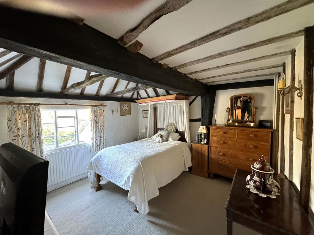 With exposed beams, window to rear, radiator, walk in wardrobes with large useful storage area. This room has flying freehold over 1 Little Loddenden’s kitchen.
