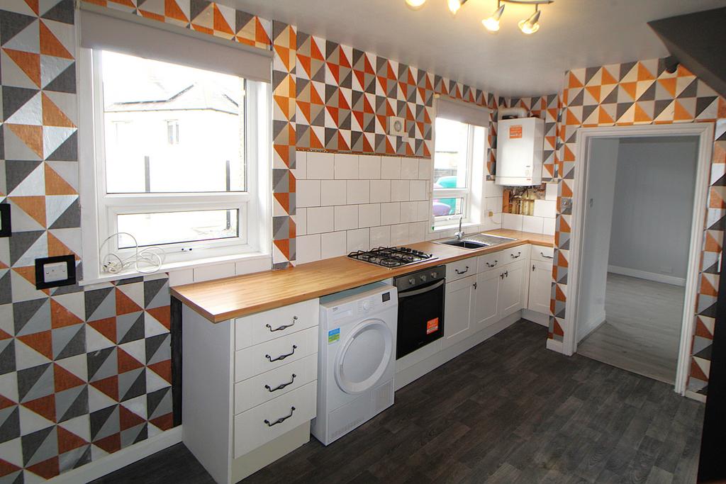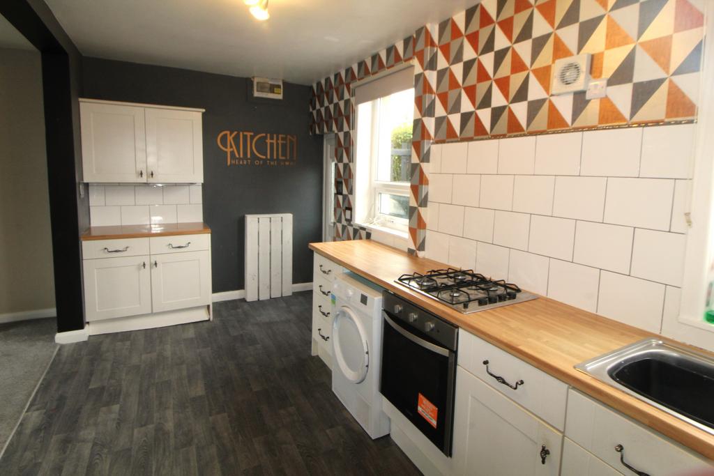 having range of base and wall units together with working surfaces. Sink unit. Inbuilt oven and hob. Two PVC double glazed windows. Gas fired boiler.