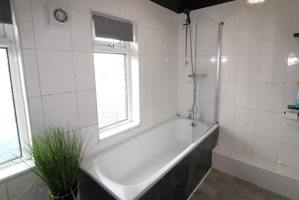 containing 3 piece white suite comprising panelled bath with shower over and glazed shower screen, pedestal wash hand basin and toilet. Radiator. Two PVC double glazed windows. Radiator. Extractor fan.
