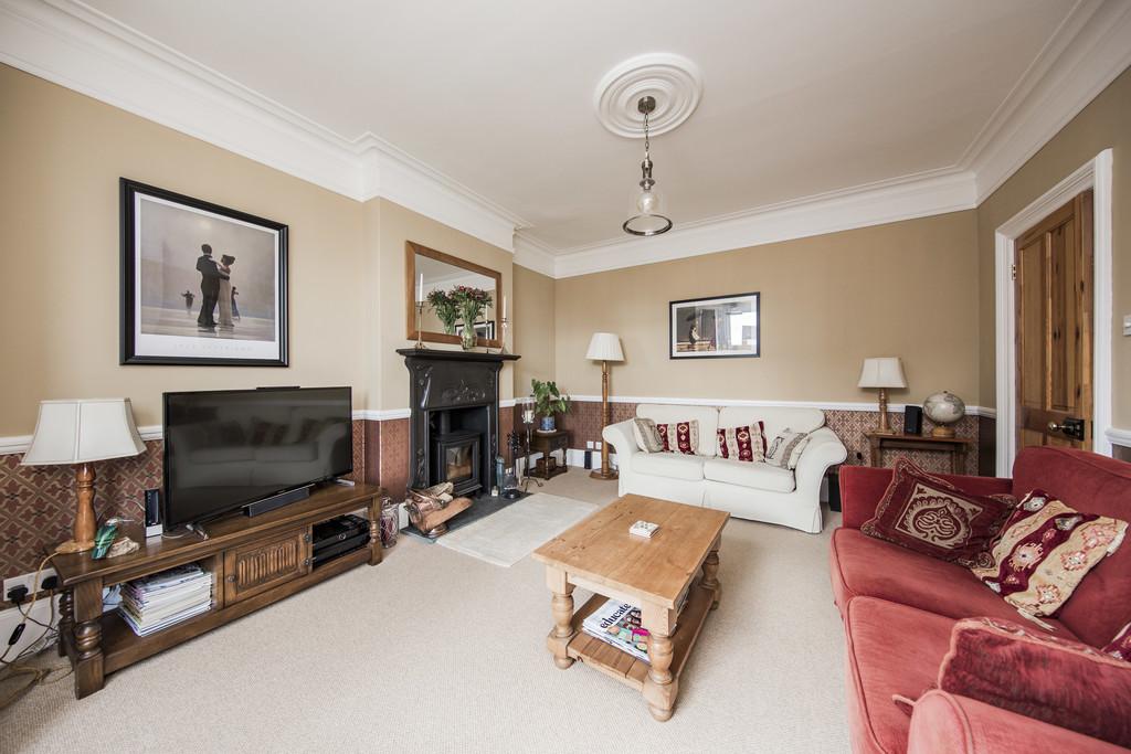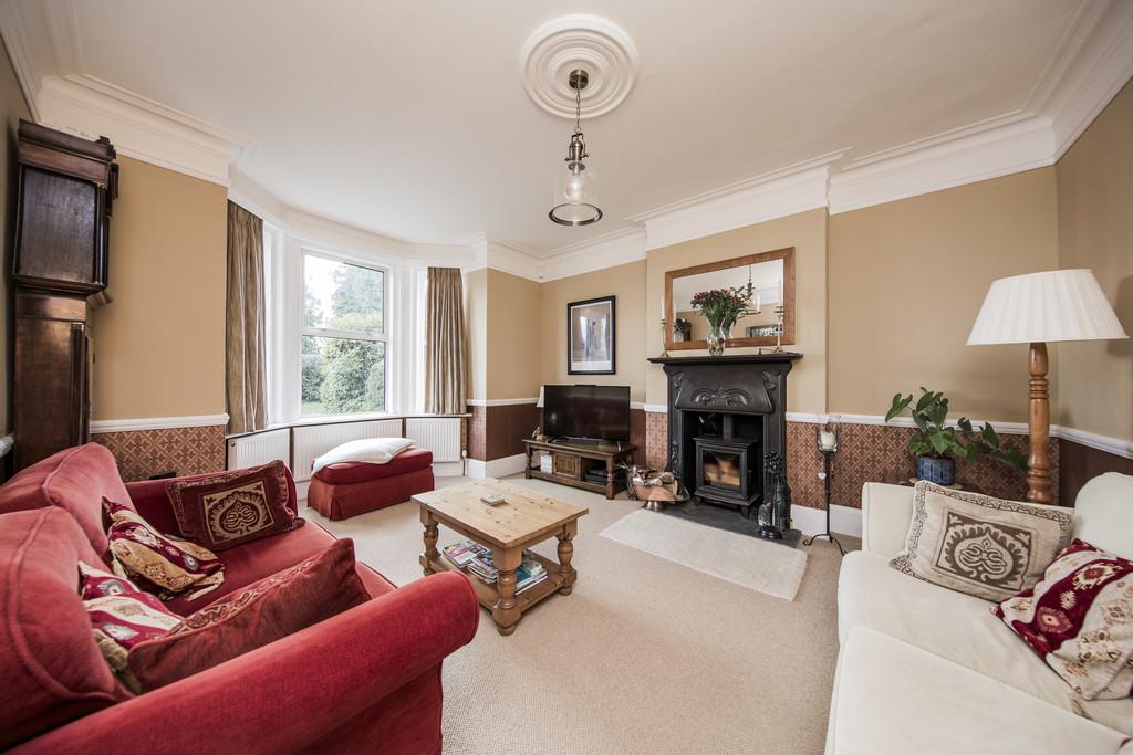 SITTING ROOM: Recently installed wood burning stove set into a period cast iron fireplace with mantle and slate hearth, fitted carpet, three radiators and bay window to front.