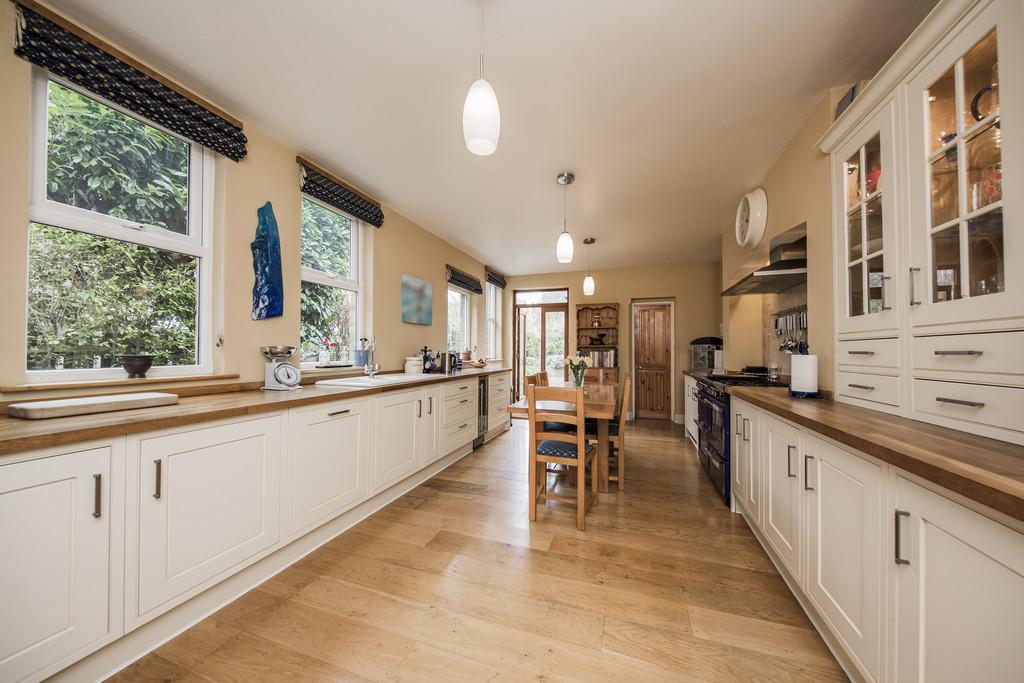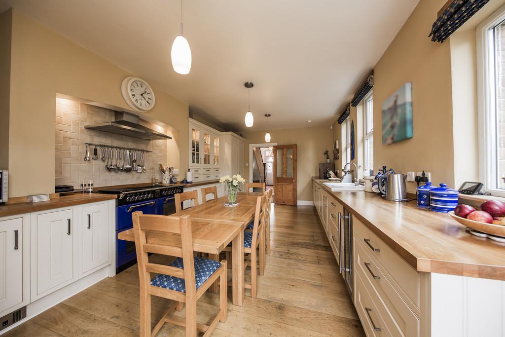 KITCHEN/BREAKFAST ROOM: Range of shaker style high and low level units to include a pull out larder cupboard and wooden oak worksurfaces incorporating a one and half bowl Butler sink. Integrated appliances include a Stoves triple oven with warming drawer, 7-ring hob with tiled splashback and extractor fan over, a dishwasher, tall fridge/freezer, low level freezer and a wine fridge. French oak flooring, four windows to side with fitted blinds and French doors open to a rear patio and garden beyond.