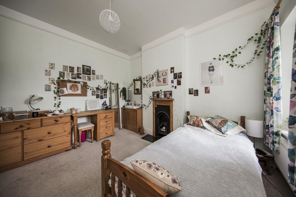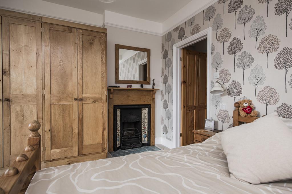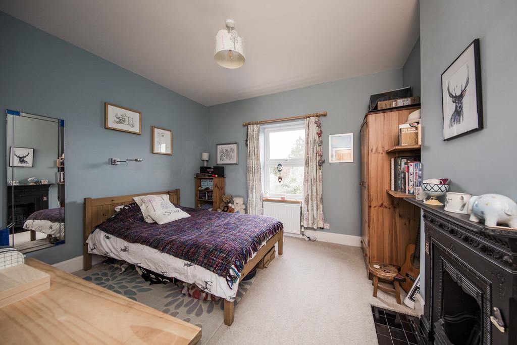 BEDROOM: Cast iron fireplace and mantle with tiled hearth, sink set into vanity unit, fitted carpet, radiator and window to rear.