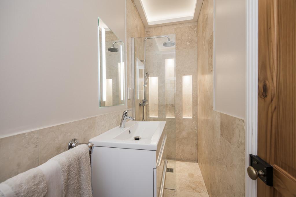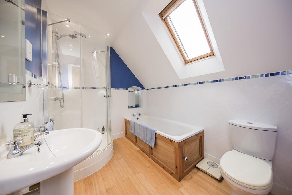 FAMILY BATHROOM: Panelled bath, fully tiled corner walk-in shower enclosure, low level wc, pedestal wash hand basin, wooden flooring, two chrome heated towel rails, shaver point, fixed mirror and Velux window.