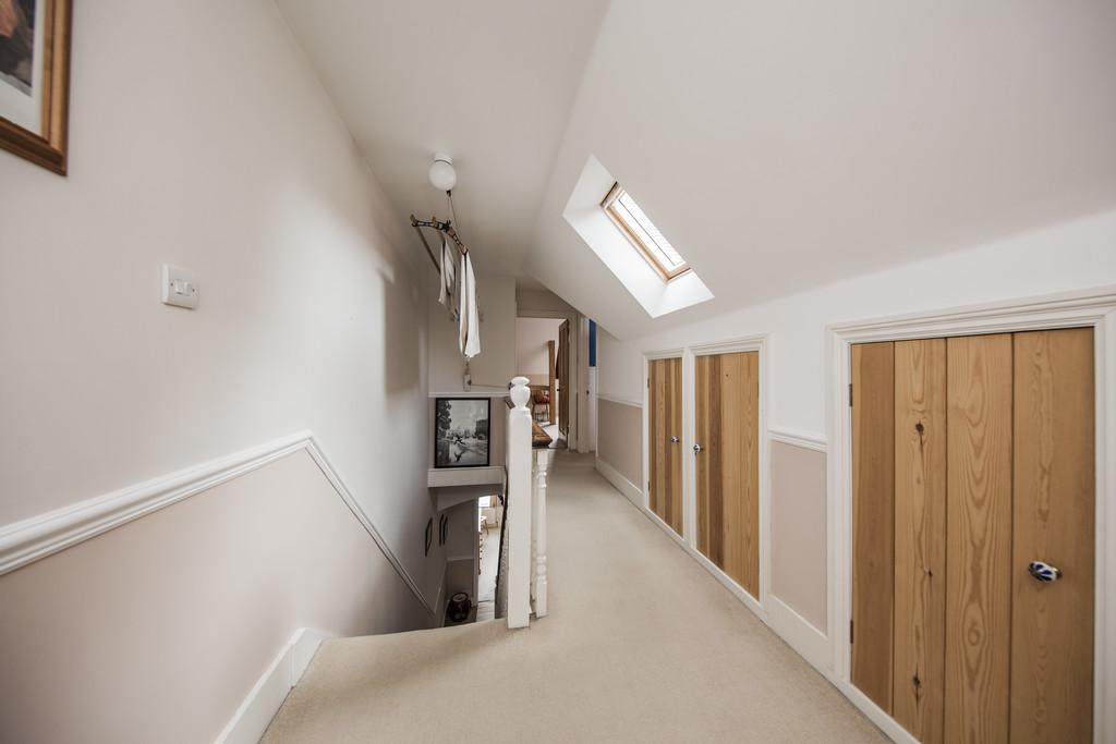 SECOND FLOOR LANDING: Range of cupboards housing hot water tank, Baxi boiler and eaves and shelved storage space. Fitted carpet and Velux window.