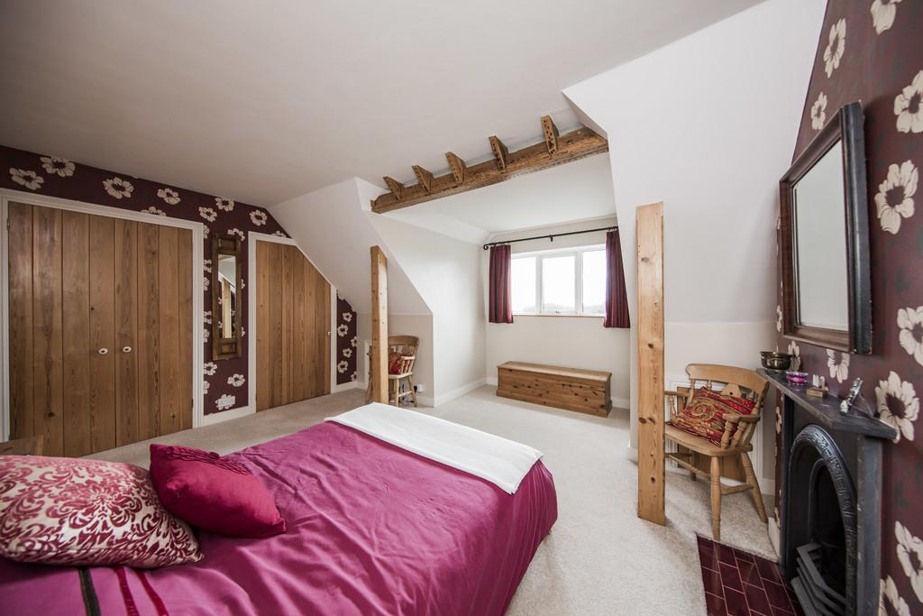 BEDROOM: Fitted wardrobe, cast iron fireplace and mantle with tiled hearth, cupboard with access to fully boarded loft with light, two further eaves storage cupboards, fitted carpet, high and low level feature beams and dual aspect with window to side and window to front with far reaching views towards Heathfield and South Downs.
