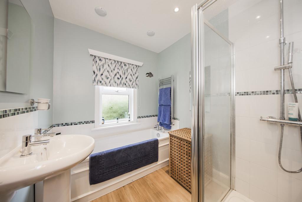 FAMILY BATHROOM: Panelled bath, fully tiled walk-in corner enclosure with rainfall showerhead and separate handheld shower attachment, sink with mirror above, wooden effect flooring and obscured window to side with fitted blind.