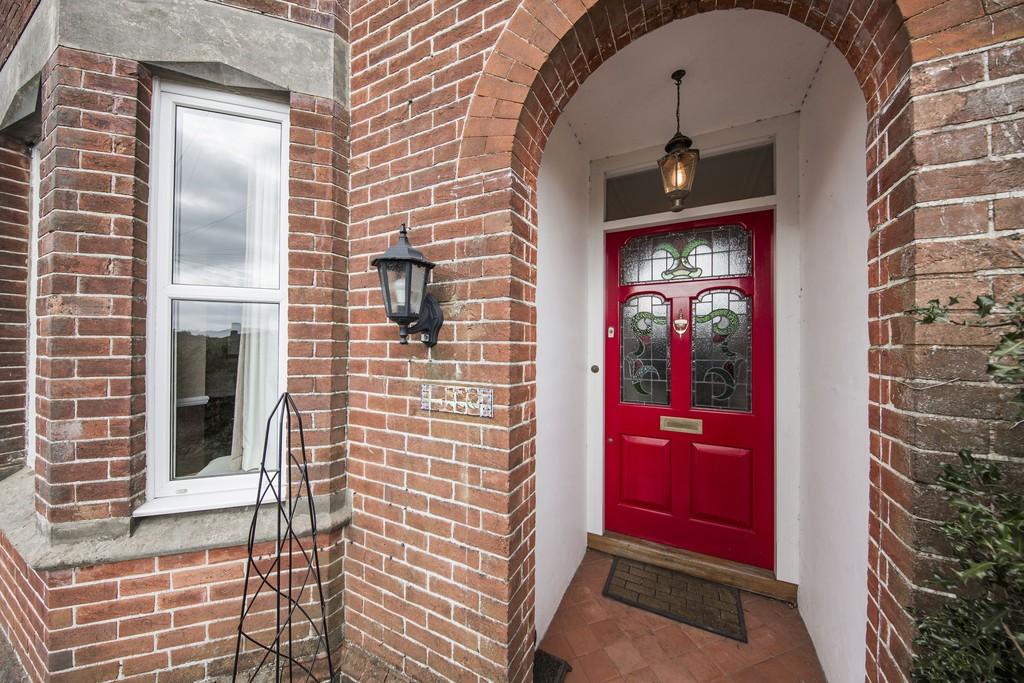 OPEN PORCH: Quarry tiled paved entrance and bespoke wooden door with stained glass inserts opens into: