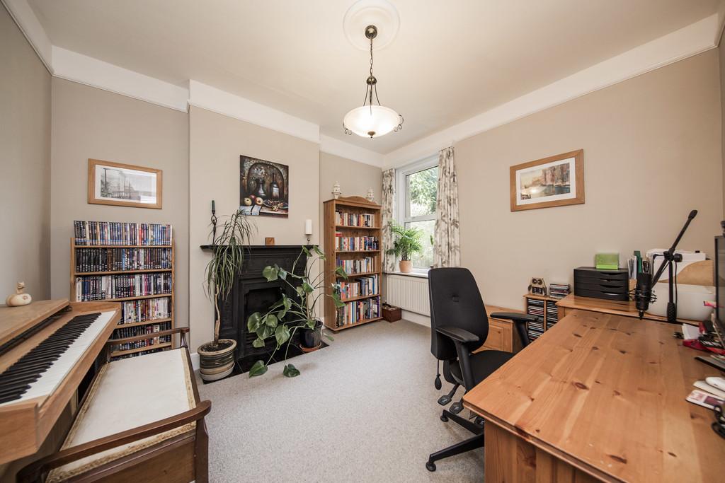 DINING ROOM: Currently used as an office/music room featuring a period cast iron fireplace with mantle and tiled hearth, fitted carpet, radiator and window to rear.