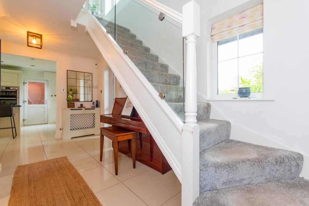 this fabulous space has a modern open plan feeling with an opening into the breakfast kitchen, doors to further accommodation, ceramic tiled flooring with underfloor heating, two ceiling light points, stairs with glazed balustrade to first floor with storage space beneath, radiator with decorative cover and UPVC double glazed window to front.