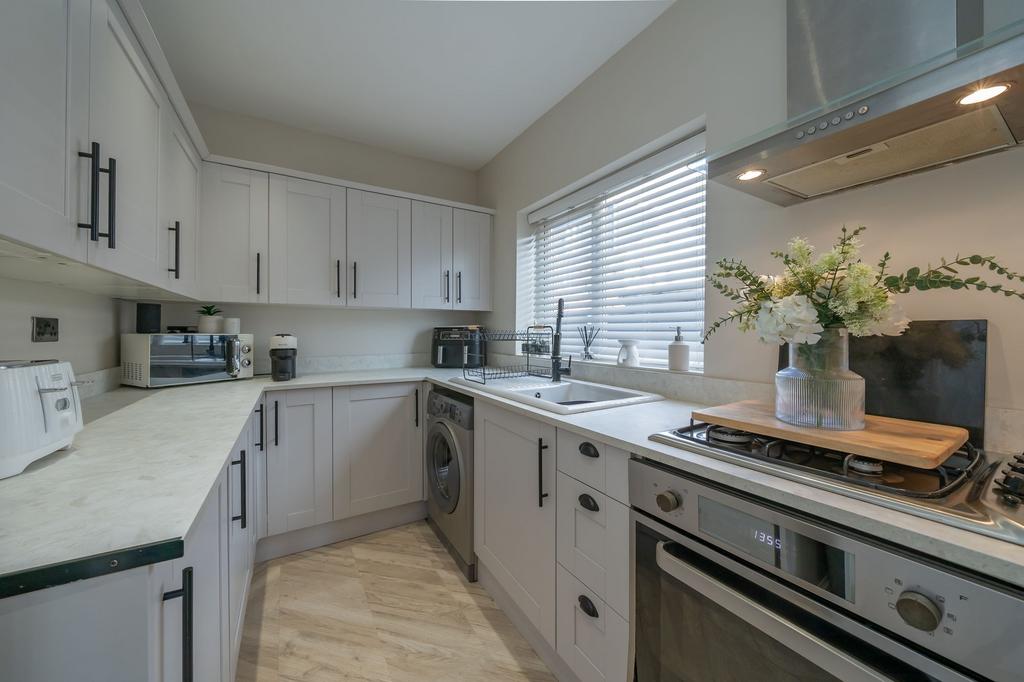 The ground floor features two well-proportioned reception rooms—a bright and welcoming front lounge and a spacious rear dining/family room, complete with patio doors that open onto the generous rear garden, flooding the space with natural light. The modern fitted kitchen offers ample storage and workspace, making it both stylish and functional.