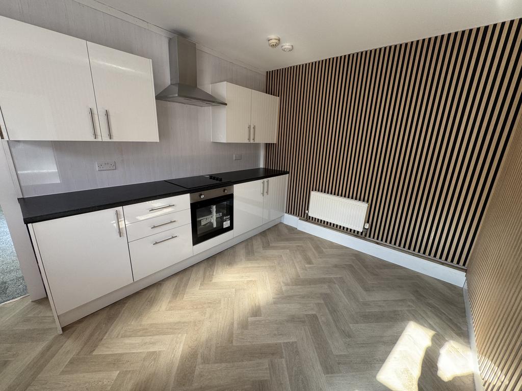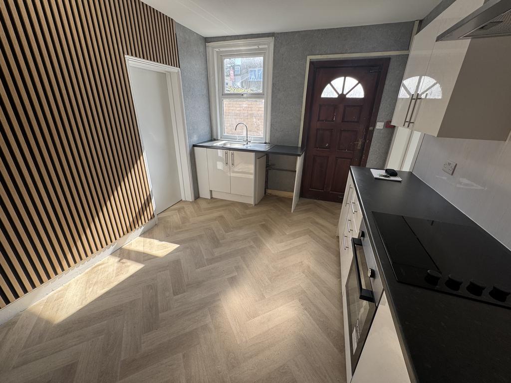Dining Kitchen. UPVC double glazed window to side, hardwood door, gas central heated radiator, range of wall and base units, electric oven and hob, stainless steel sink unit.