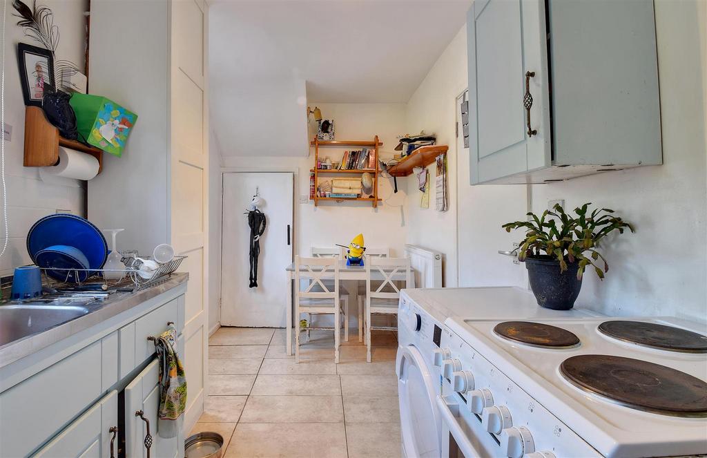 Kitchen/Dining Room - 4.45m x 2.01m (14'7 x 6'7) - Fitted with a range of light blue cupboard and drawer base units with matching wall mounted cupboards, complementing work surface with inset stainless steel sink/drainer unit and tiled splash-backs, space and point for electric oven, space and plumbing of washing machine, space and point for tumble dryer, upright cupboard housing wall mounted gas fired boiler, tiled flooring, radiator, space for table and chairs, under stairs storage cupboard with space and point for free standing fridge/freezer, window to the rear elevations and part glazed door allowing access through to the garden.