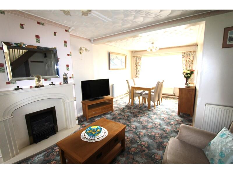 Approximate size 5.18m (max) x 6.61m L Shaped Room. Feature fire place with a living flame effect gas fire, radiators, multiple power points, carpet, open plan stair case to the first floor, and sliding patio doors leading to the front garden.
