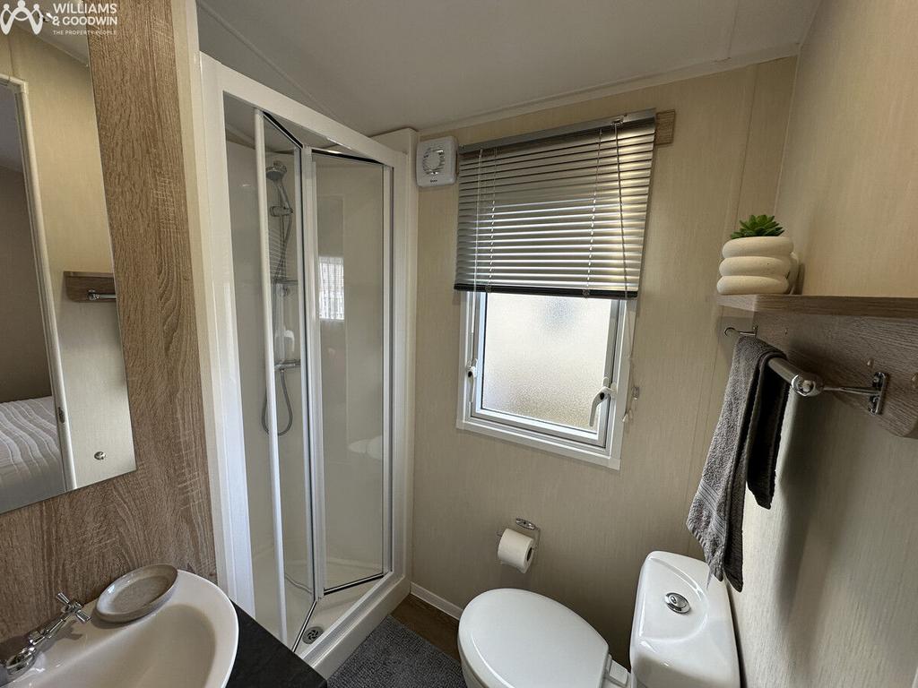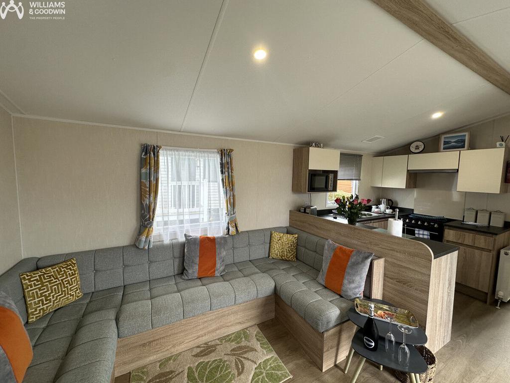 An extremely well presented and tastefully decorated open plan living area which is laid out to provide a living area, dining area, fitted kitchen and with the sofa being a pull out bed, another sleeping area in the static. With a range of built storage cupboards, the kitchen has a range of base and eye level units with worktop space over units. Within the kitchen is a cooker and built in fridge/freezer. The open plan living area offers bright and airy accommodation with windows to both sides with further available space for a dining room table set and large sofa bed. Doors lead into the ground floor rooms.