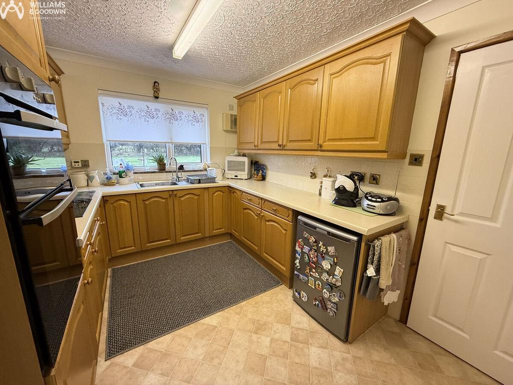 Fitted with a matching range of base and eye level units with worktop over and stainless steel sink. Built in double oven and ceramic halogen hob. Space for freezer. Window to rear. Door to:
