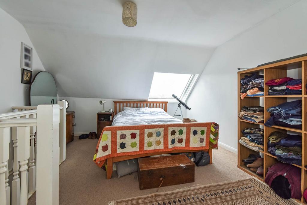 Stairs lead to the upper floor, where the principal bedroom is situated within the loft space. This bright and airy room offers a sense of privacy and character, with ample space for furnishings.