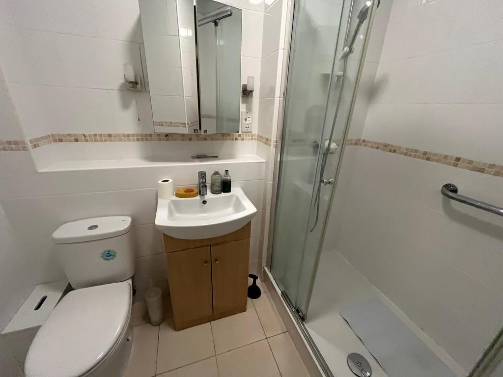 SHOWER ROOM: Vanity wash basin with mixer tap and low level W.C., with tiled surrounds, radiator, extractor unit, mirrored cupboard, shower cubicle with mains shower unit, fully tiled surround.