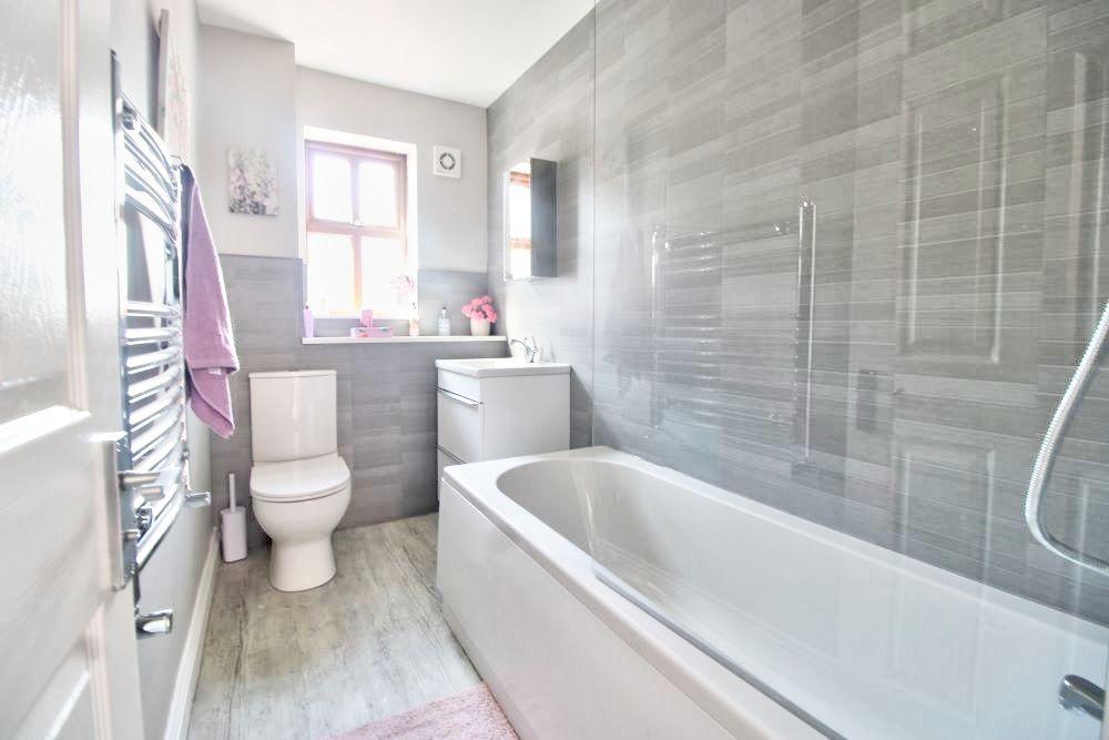 A white suite comprising of a panelled bath with shower screen and electric shower over, low level W/C, wash hand basin with vanity cupboard under, tiled walls, double glazed window to the rear aspect. Laminate flooring. Heated towel rail. Extractor fan .
