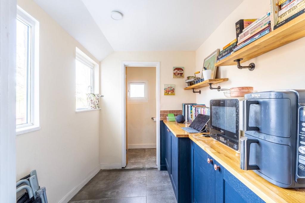 Upon entry, the inviting bay-windowed reception room sets the tone with its light-filled, spacious feel, offering the perfect place to relax or entertain. The dining room, bathed in natural light, flows effortlessly into the newly installed shaker-style kitchen. Featuring a beautiful Belfast sink, rose gold fixtures, and a rich blue color palette, the kitchen is both stylish and functional, making it ideal for family gatherings and meal preparation. Practicality is also offered with a convenient utility room and guest WC, adding to the home’s versatile layout.