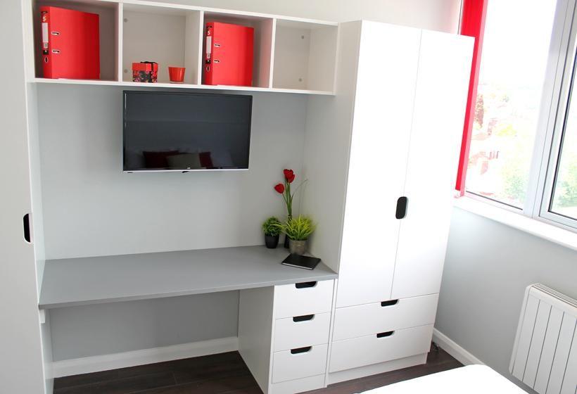 Each self-contained studio has been superbly designed and features a contemporary kitchen with two hobs, combi-microwave oven and a 50/50 fridge/freezer. The studio also includes a double bed, individual en-suite facilities, a flat-screen TV, and generous study and storage space. Free on-site facilities and lift access are available for all residents.