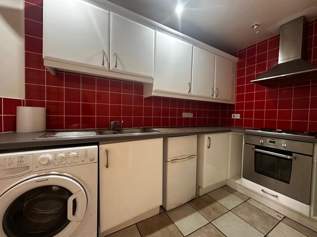 Kitchen with oven, hob, under worktop fridge and washing machine provided.