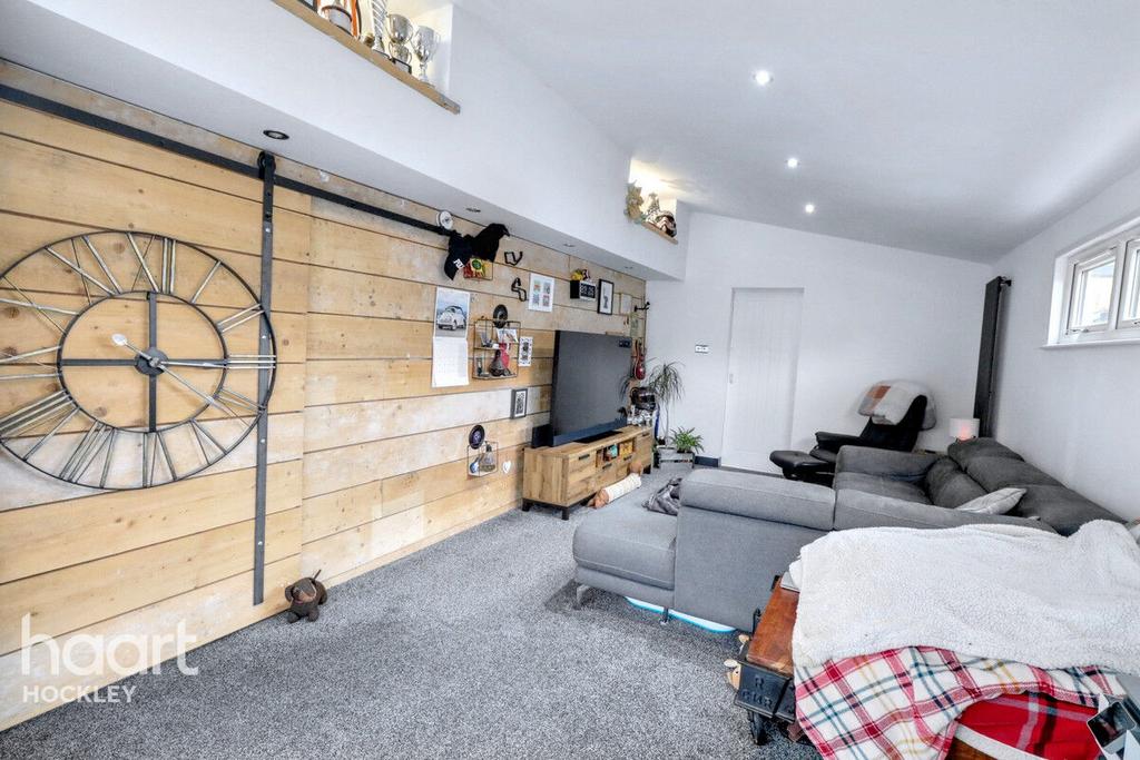 Fitted carpet, radiator, double glazed window to front, double glazed box window to side, feature wood panelled wall, smooth vaulted ceiling with fitted spotlights, sliding door to: