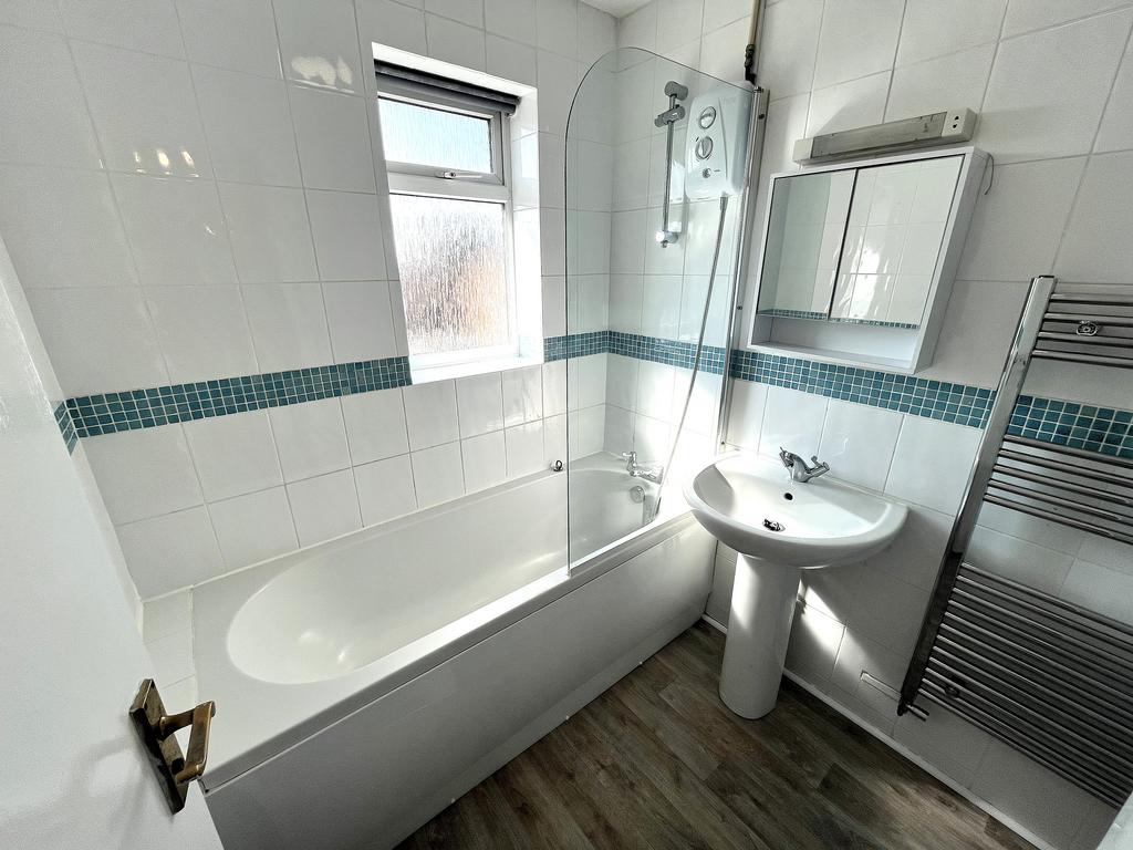 The family bathroom is laid with wood effect flooring and includes a three piece suite with shower over bath.