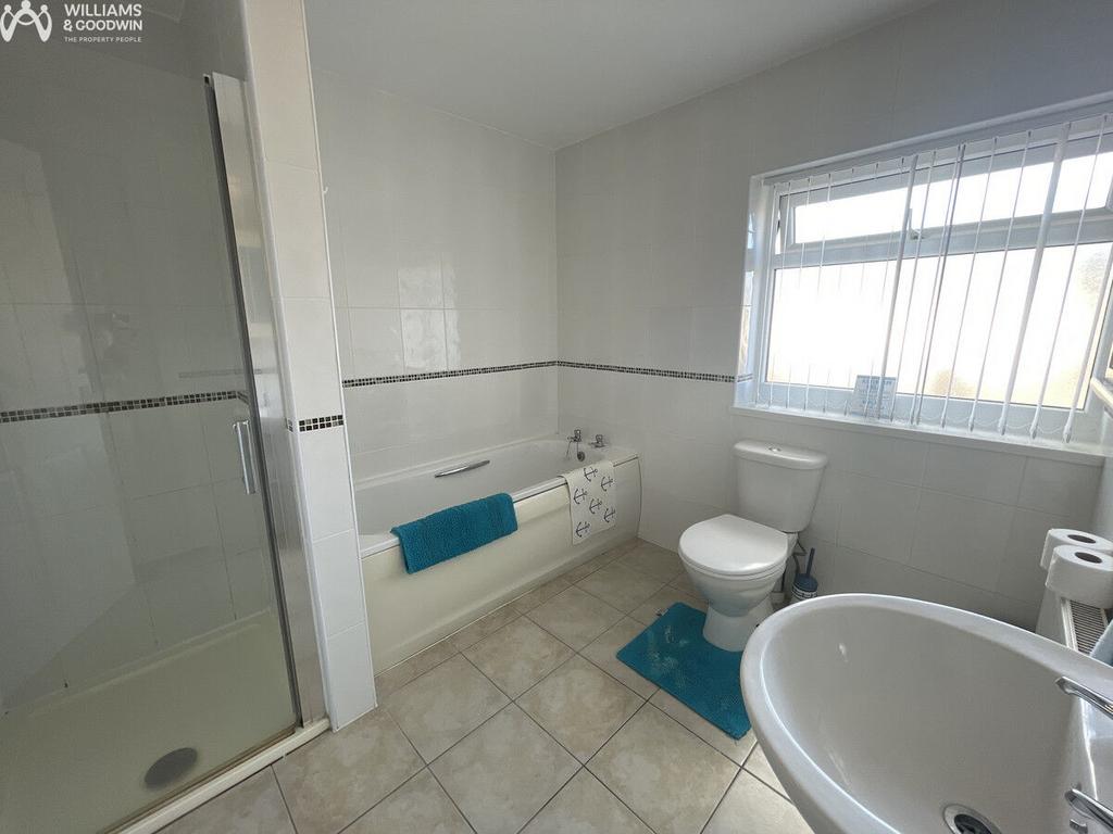 Four piece suite comprising bath, pedestal wash hand basin, tiled shower enclosure and WC. Tiled surround. uPVC double glazed window to rear. Tiled floor. Door to Storage cupboard housing boiler.