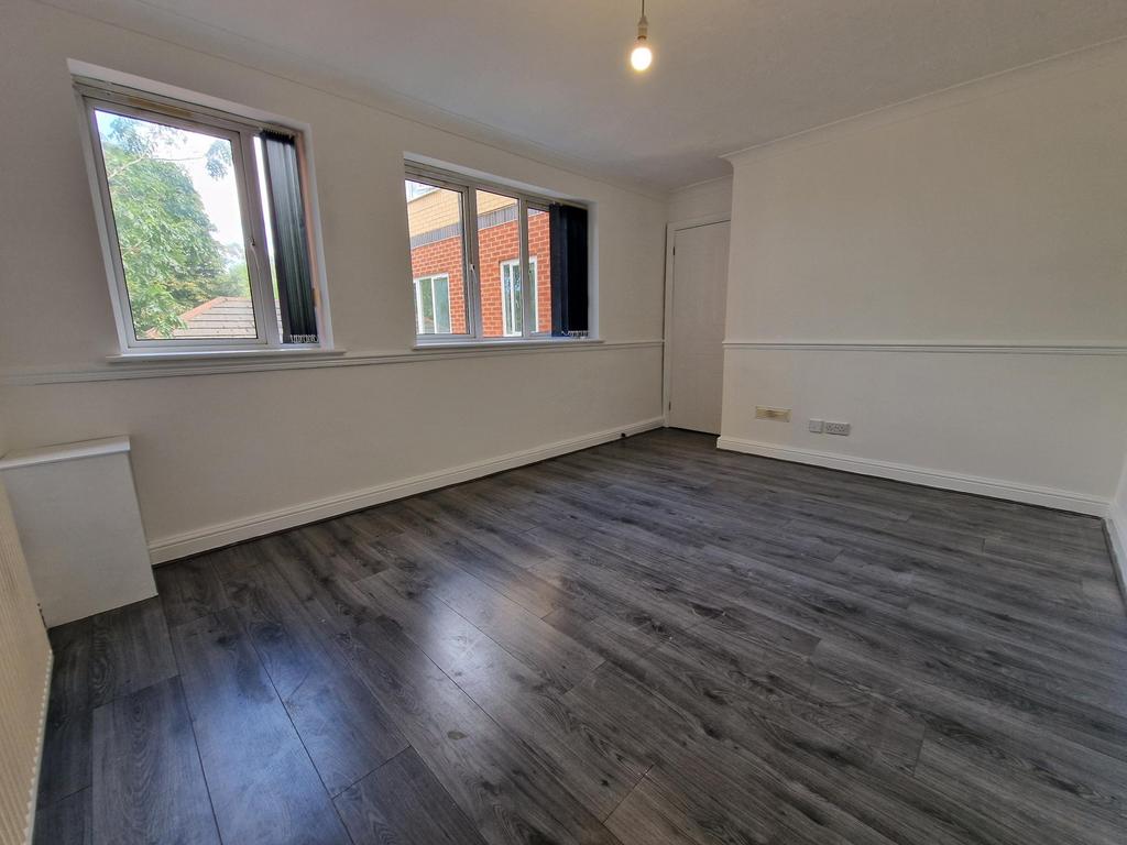 A bright, spacious, living room painted in white, with grey wood effect flooring, central ceiling light, radiator, two windows overlooking the rear of the property and small cupboard housing the gas meter.