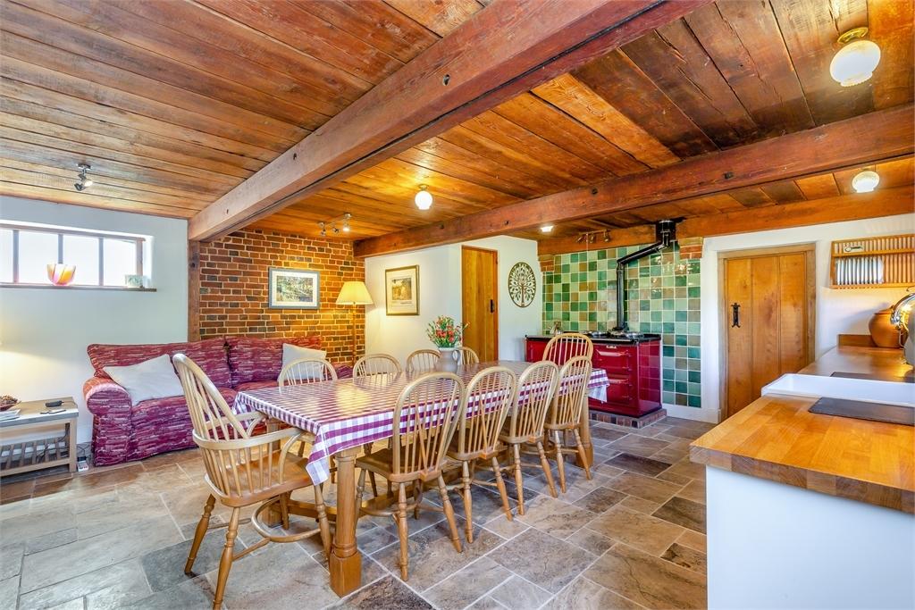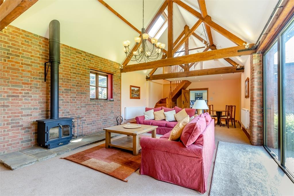 Exiting the drawing room into the barn annexe you find an ensuite bedroom. Next is an excellent fully equipped kitchen/breakfast room prior to the wonderful open structure living area that incorporates a dining space. Stairs rise up to the mezzanine room and boast a perspective across the impressive roof timbers and rafters of the living room.