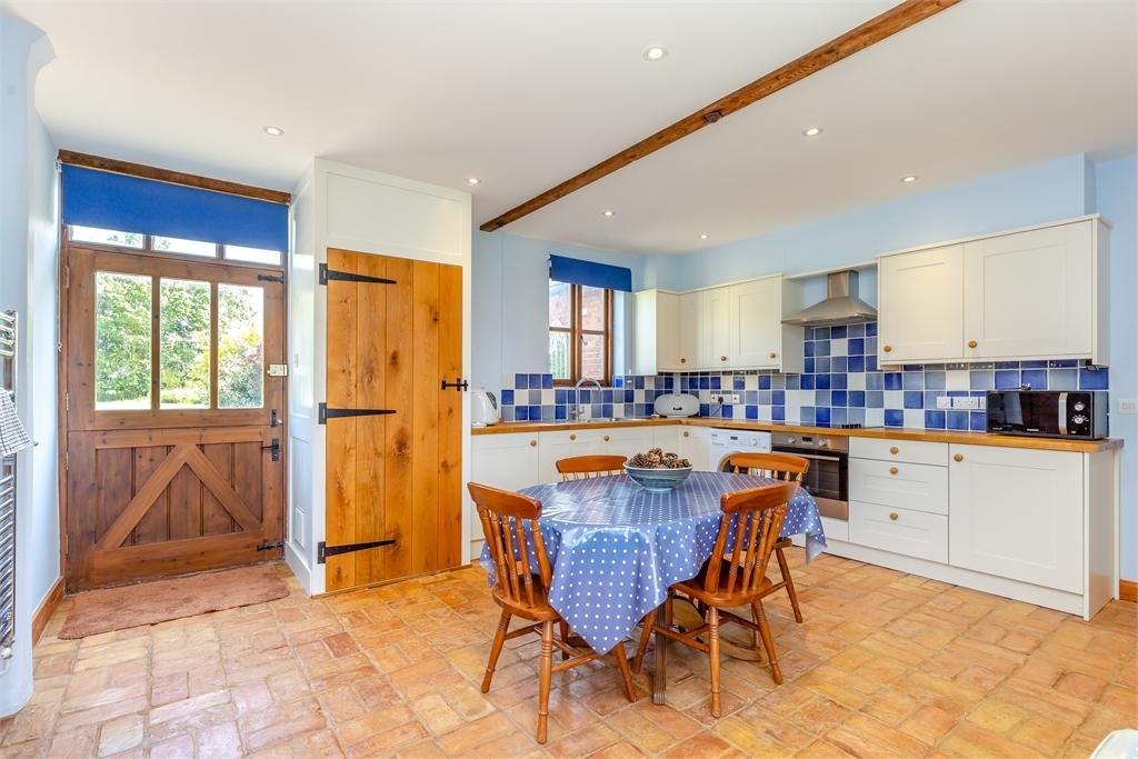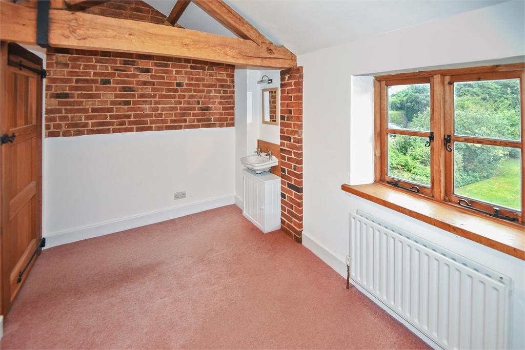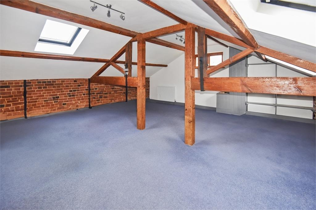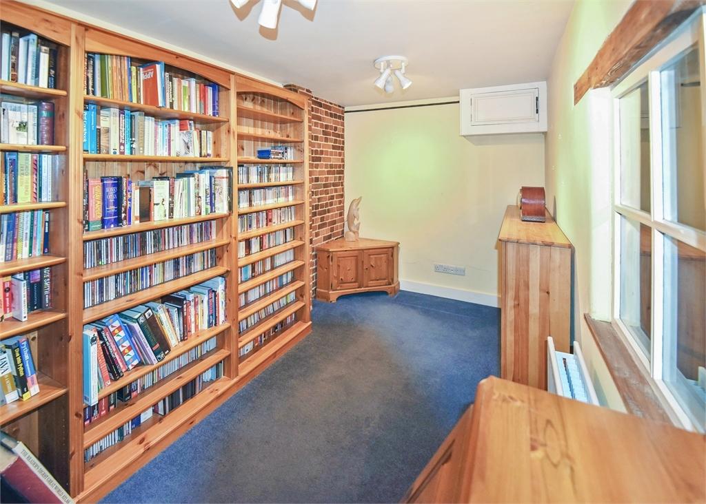 Both the reception hall and kitchen retain ceilings comprising thick wooden boards, a remnant of the buildings past when the granary loft would have been above. The utility room acts as a second kitchen providing homes for all the appliances alongside an oven and halogen hob. There is then the office or study with built in shelved cupboards and a pretty arched window looking onto a small courtyard.