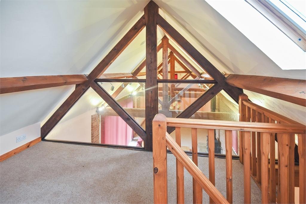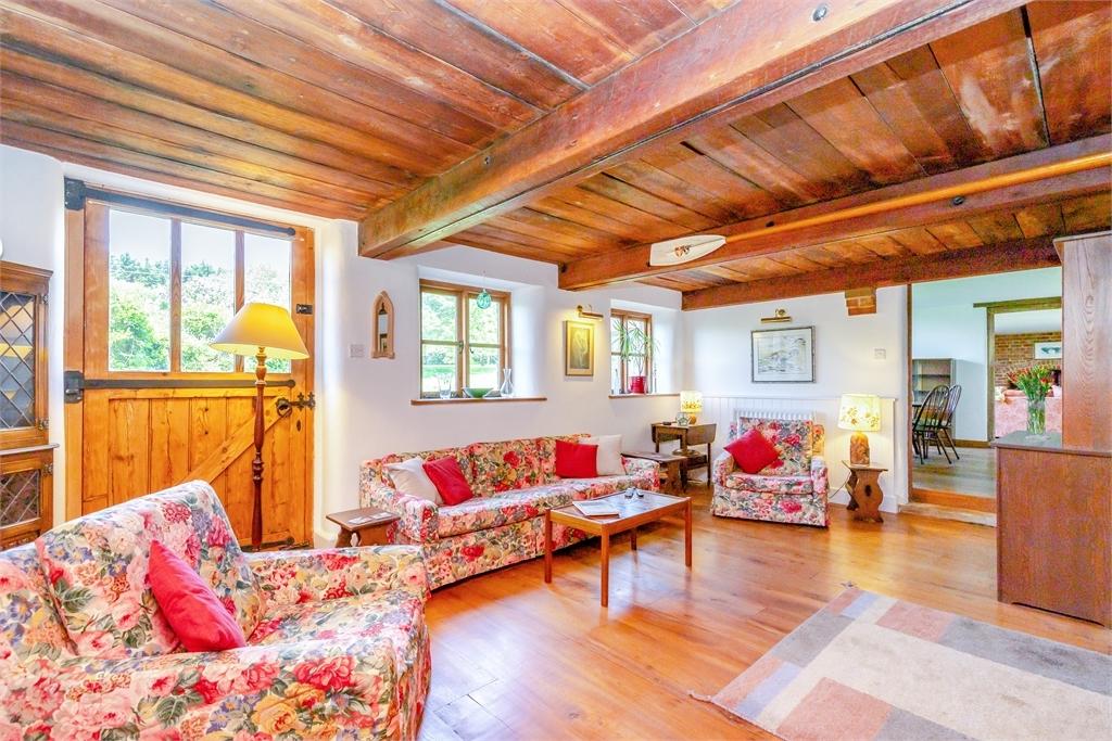 The first floor contains five bedrooms, four of which are doubles and the fifth a very decent single. The main bedroom has an ensuite shower room, two of the guest rooms have wash basins, and there is a family bathroom. Worth mention are the attractive galleried landing over the drawing room and in one of the guest bedrooms the wonderful antique pulley mechanism still in situ from a time when the hay trolley would have been pulled back and forth between the mow hayloft and threshing floor area below.