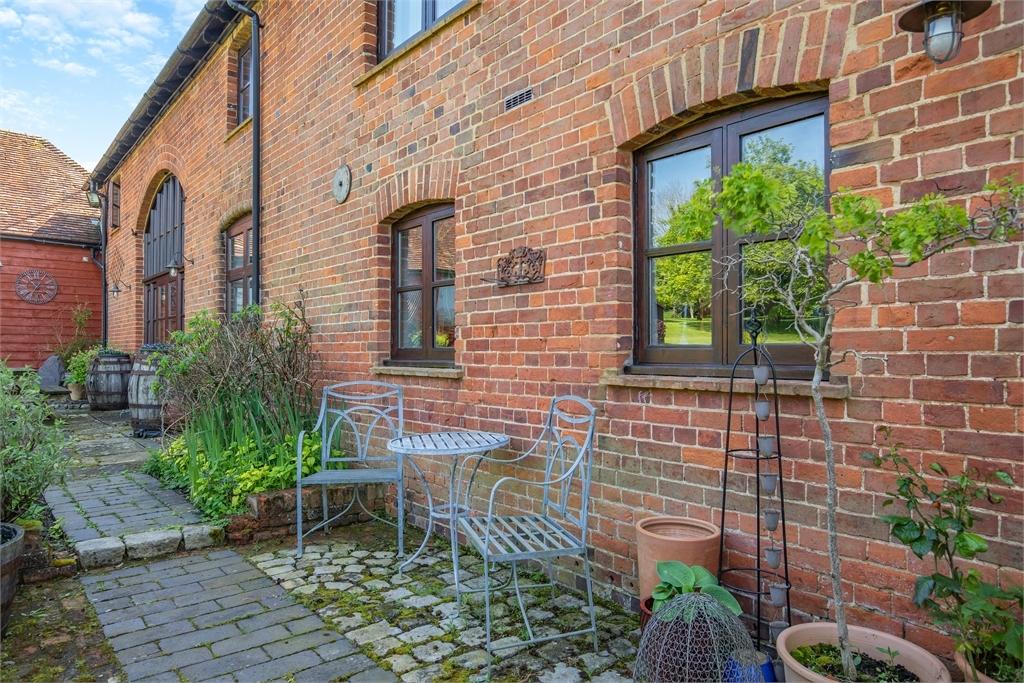 Across the rear of the barn are brick and stone cobbles and patios to absorb the outlook which is a haven for wildlife.