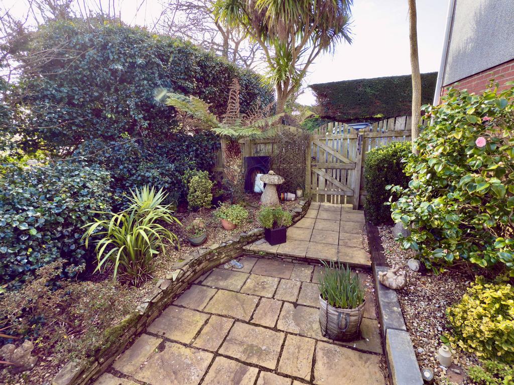 Garden gate provides access to the side of the property to attractive flower boarders, stairs ascend to the: