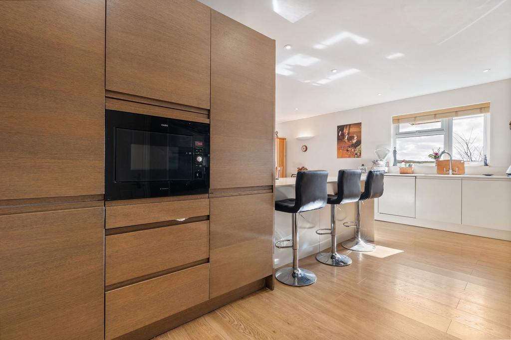 Comprehensive range of base and wall units with Quartz worksurface and upstand over, integrated oven and grill, integrated microwave, integrated tall fridge and freezer, 4 ring induction hob with extractor hood over, integrated dishwasher, central island with seating and storage, the room extends to provide a dining table with ample seating for 6 and two comfortable sofas from which to enjoy the stunning views. French doors into LIVING ROOM (see later) and French doors to: