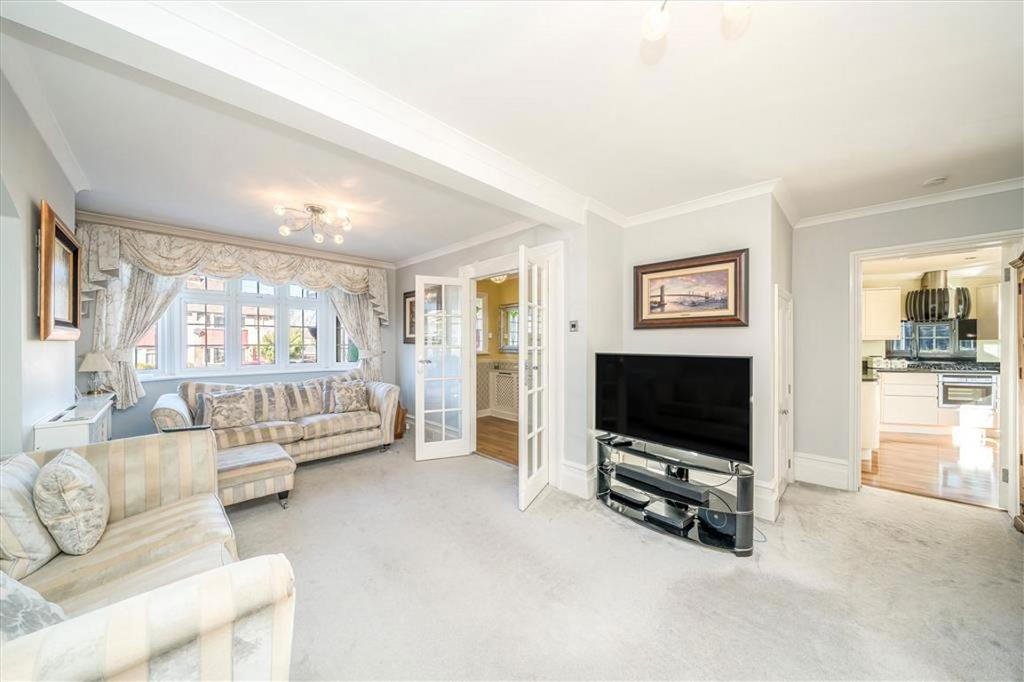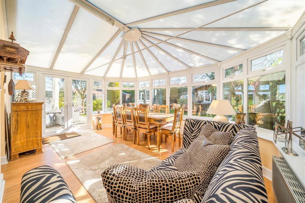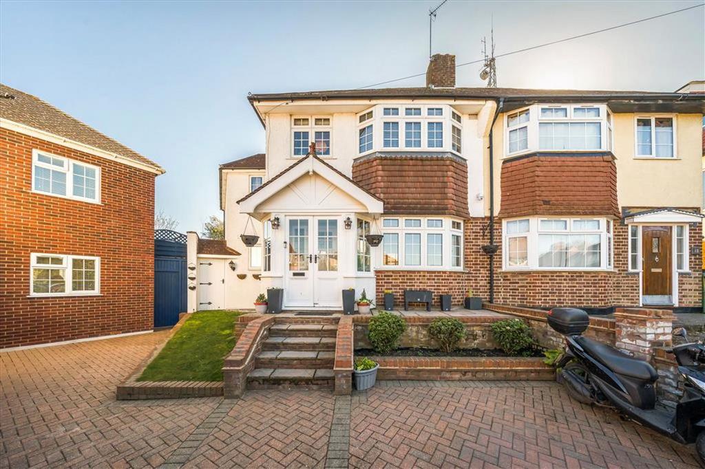The property is set nicely back from the road behind a deep front garden and driveway. It has a wide and inviting entrance hall running through into the generous L-shaped double reception which leads into a conservatory creating space for a generous dining area. A large kitchen has been created by extending to the side of the property, it features sleek white units with high-quality worktops and integrated appliances. There is also a useful shower room/WC on the ground floor and handy side access to the house.